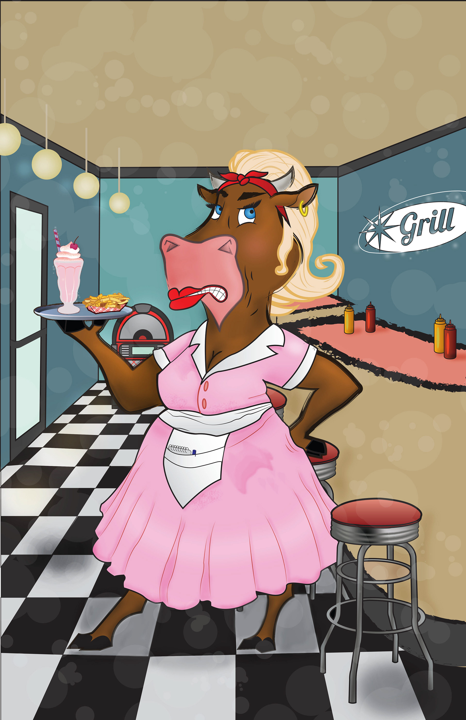 A personified young and sassy female cow who is fed up with being a diner waitress in the 1950s.